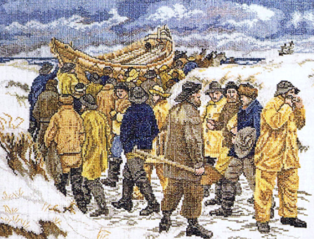 Based on the painting by Michael Peter Ancher, this cross stitch kit depicts a lifeboat being taken to the ocean by horses and fishermen. Measures 47 x 38 cm.