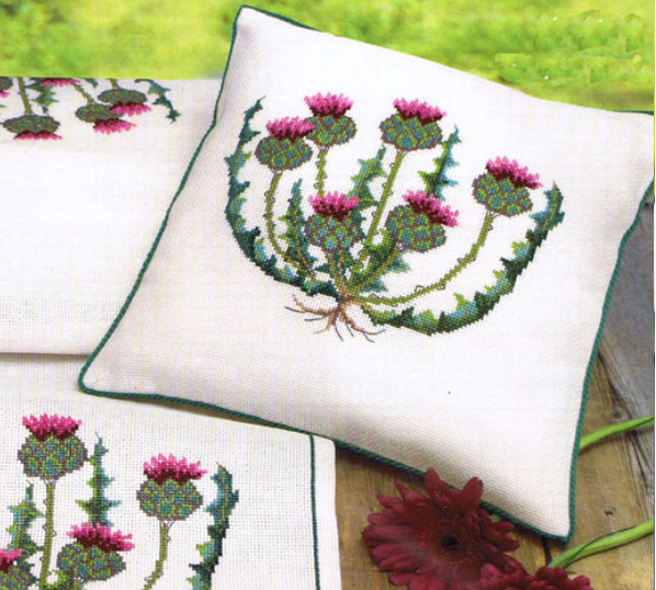 Beautiful cushion cover with a Thistle on the front. The cross stitch kit measures 35 x 35 cm.